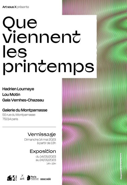 Galerie du Montparnasse, ParisC’est sur le sol quadrillé de la Galerie du Montparnasse, que se trame cette exposition à trois mains. À l’issue d’une première rencontre lors de la résidence Bouchor à l’automne 2022, Lou Motin, Hadrien Loumaye et Gala Vernhes-Chazeau se retrouvent à nouveau en cette saison nouvelle.