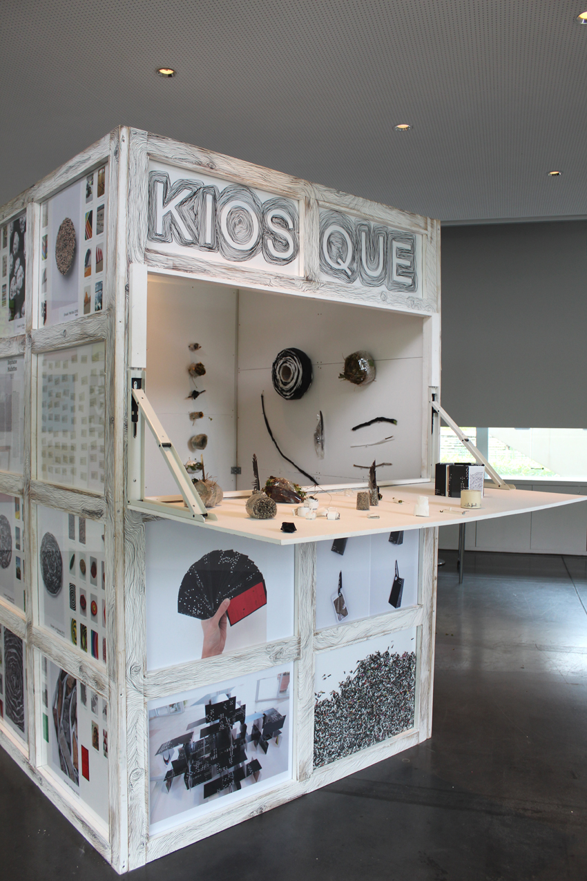 Construit et installé une première fois dans le Lycée professionnel agricole Gustave Rieffel de Nantes en 2019, il est réactivé actuellement au MAC VAL. Les façades diffusent des éléments relatifs à l’édition monographique DÉ RE RÉ, publiée aux éditions amac en 2019 et dont le MAC VAL est un des partenaires, ainsi que des projets de parties de Domino d’artistes réalisées en septembre 2019 au Musée lors des Journées du Patrimoine.À partir du 19 octobre 2019, KIOSQUE sera alors démonté et fera l’objet d’un nouvel atelier avec la classe prépa de l’École d’art de Vitry-sur-Seine.