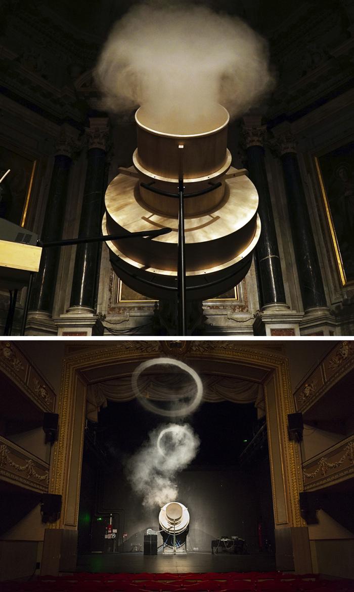 du 13 au 22 septembre 2019Guillaume Cousin est l’inventeur d’une sorte de gigantesque machine-canon composée de bois et d’acier. Celle-ci projette cycliquement de grands cercles de fumée se déplaçant lentement à la lueur d’une lumière chaude, et étirant une légère traînée à chaque passage. Des volutes aux allures spectrales se dessinent alors sous les yeux des spectateurs. Les créations éphémères finissent inévitablement par se rompre avant de se dissiper intégralement. Ce vortex vivant, sa matière et ses mouvements, évoquent de majestueuses méduses issues des abysses… un monde silencieux, invisible et pourtant à portée de main.